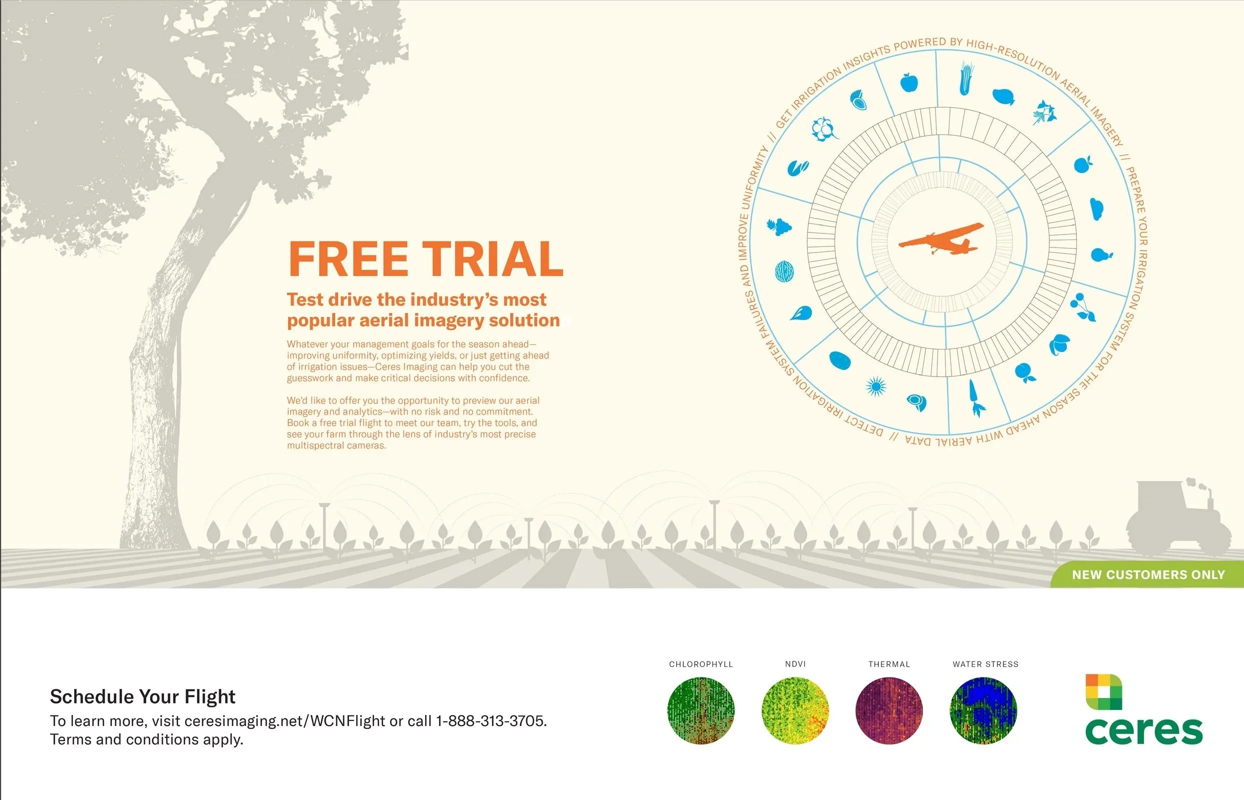 Ceres Imaging came to me with the need for an ad campaign. Based in California, the land of plenty, they provide a service to farmers to help them better manage their crops. They wanted to feature the plane, as that is how the scanning happens as well as the fields, possibly crops and people. This required a few different ideas to be worked out to show direction, and ultimately they chose one idea and we rolled that design out to all the needed formats needed.